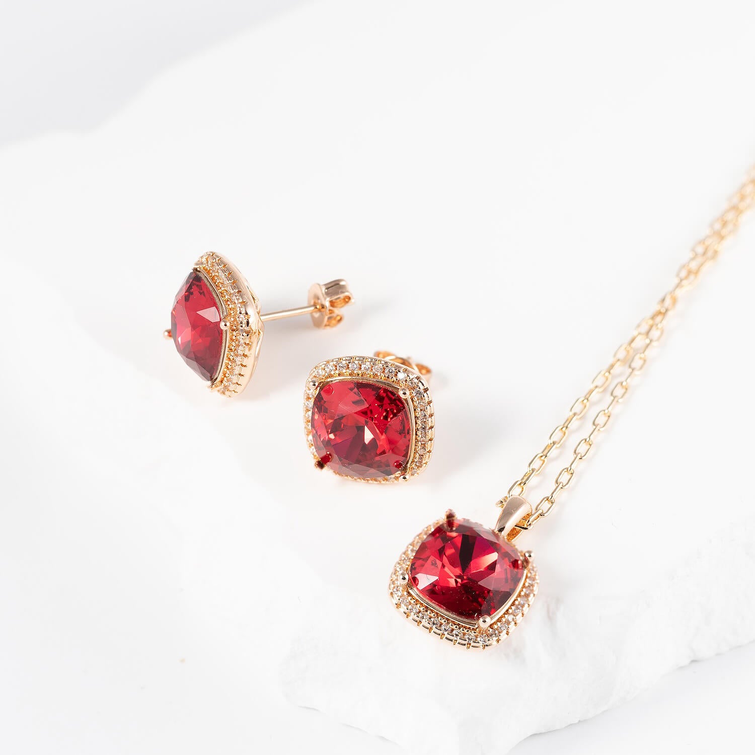 Skaists un izteiksmīgs rotu komplekts MEŽROZĪTE - auskariņi ar kvadrātveida kristāliem un pieskaņota kaklarota! Maigums un neticams mirdzums elegantā kristālu formā! Antialerģiskais rotu komplekta materiāls derēs arī jutīgai ādai.